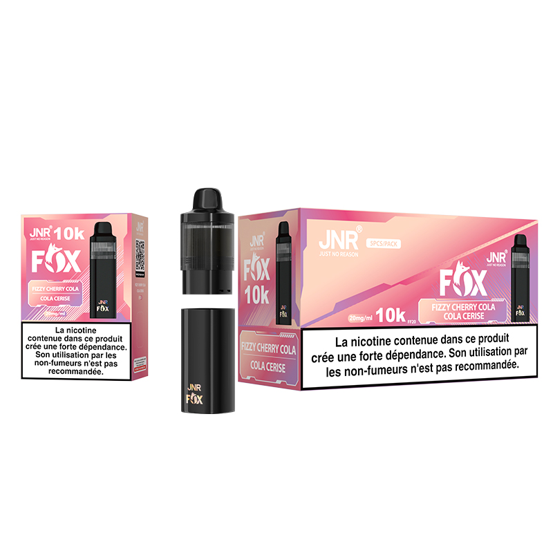 Découvrez la Puff JNR FOX 10000 Cola Cerise, la nouvelle génération de puff alliant puissance, autonomie et saveur rétro irrésistible. Conçue pour offrir une expérience de vape longue et gourmande, cette puff 2 % nicotine (20 mg/ml) séduit par son goût unique de cola pétillant subtilement relevé par une note de cerise sucrée.