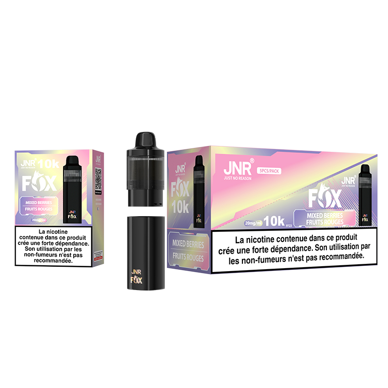 La JNR FOX 10K incarne l’alliance parfaite entre autonomie, saveur et simplicité. Grâce à sa technologie Mesh Coil et sa batterie rechargeable, elle offre une expérience de vape fluide, aromatique et sans contrainte. Un choix idéal pour ceux qui souhaitent vapoter longtemps, sans recharger ni remplir fréquemment. | Puff JNR FOX 10000 – Goût Cerise Baies – 2 % Nicotine