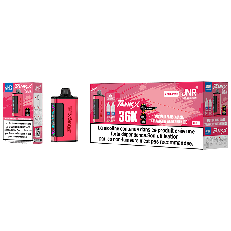 | Description | Puff JNR Tank X 36K Strawberry Watermelon Ice : douceur fruitée et fraîcheur intense